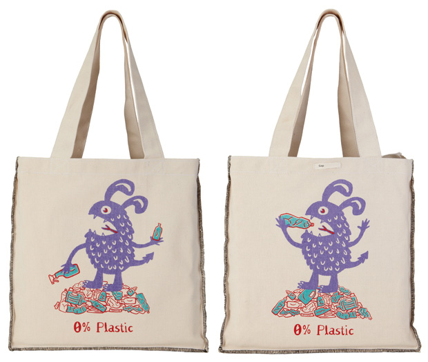 The 0% Plastic Bag initiative was started in 2009 to support the global green movement by encouraging customers to use this cotton tote bag in place of disposable plastic bags. Each illustrator was invited to reinterpret the original design of the bag while maintaining the “0% Plastic” tagline.